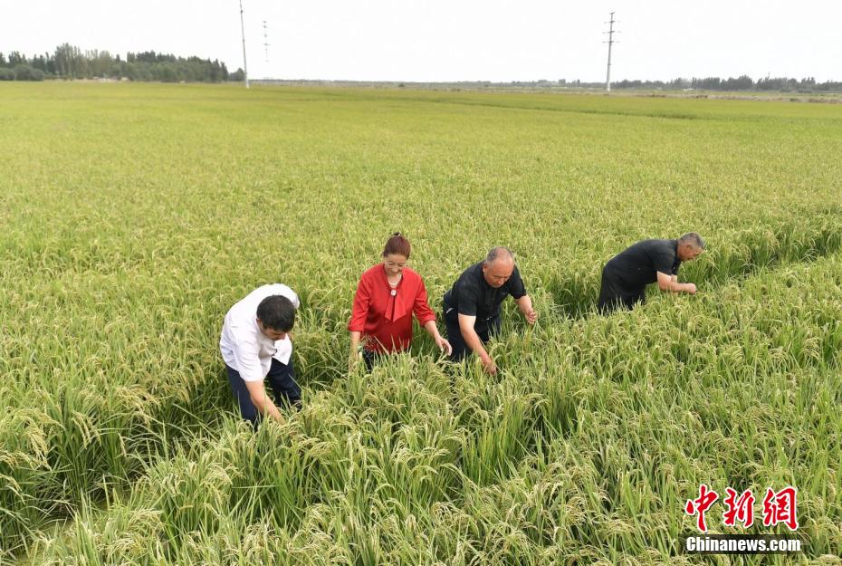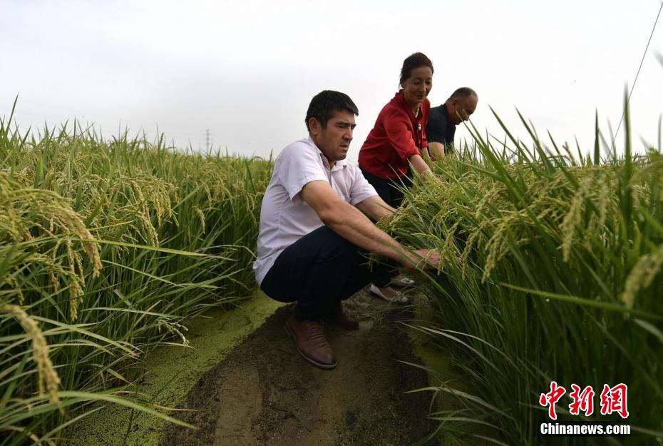 如今的稻香村已稻田连片,独特的沙漠稻田景观让这个沙漠边缘的村庄焕发出新的生机。这里产的水稻粒小饱满且带红丝,颇受市场青睐,也成为山水林田湖草沙系统治理的示范点。图为稻香村村民在稻田里除草、查看水稻长势。 中新网记者 刘新 摄