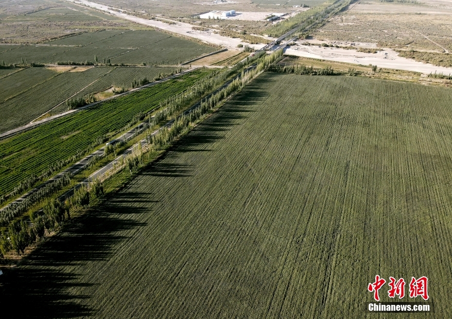 9月6日,航拍新疆阿克苏沙雅县滴灌式棉花田。(无人机照片)中新社记者 张宇 摄