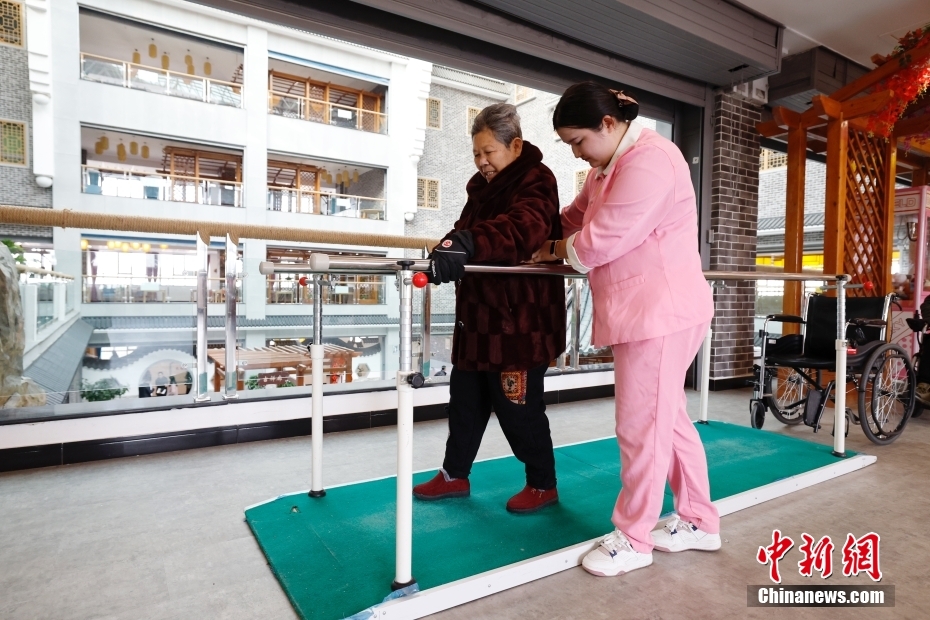 12月11日,新疆图木舒克市粤康社会福利院,老人在社工的帮助下进行康复训练。(中新社记者 韩海丹 摄)