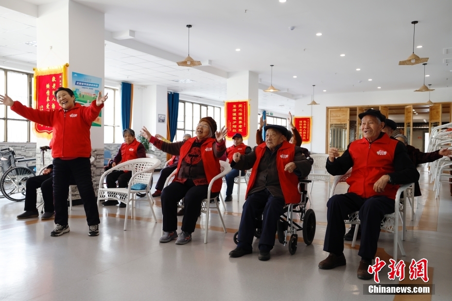 12月11日,新疆图木舒克市粤康社会福利院,老人们在社工的带领下活动身体。(中新社记者 韩海丹 摄)