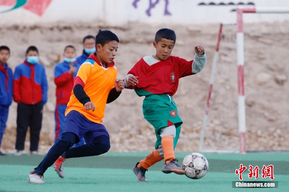 新疆很多人喜爱足球。在新疆阿图什,人们更是骄傲于当地浓厚的足球氛围和良好的群众基础。13日,中新社记者来到阿图什市上阿图什镇依克萨克小学,一场乡村小学间的足球赛正激烈进行。图为比拉力·阿布都克热木(右一)在比赛中带球。(中新社记者 韩海丹 摄)