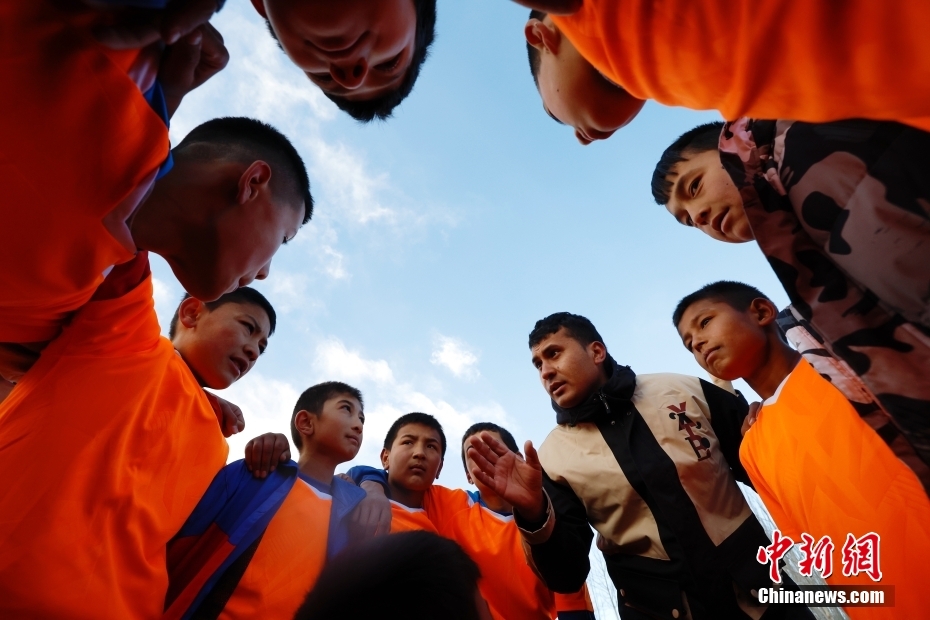 新疆很多人喜爱足球。在新疆阿图什,人们更是骄傲于当地浓厚的足球氛围和良好的群众基础。13日,中新社记者来到阿图什市上阿图什镇依克萨克小学,一场乡村小学间的足球赛正激烈进行。图为足球队教练玉山江·艾买提指导球员战术。(中新社记者 韩海丹 摄)