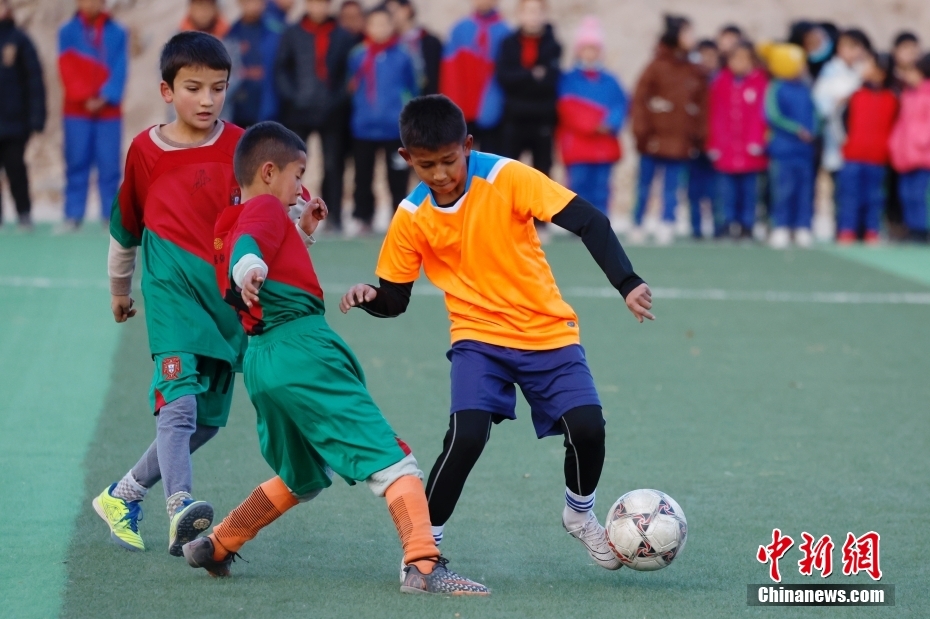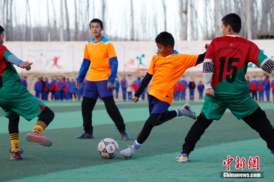 新疆很多人喜爱足球。在新疆阿图什,人们更是骄傲于当地浓厚的足球氛围和良好的群众基础。13日,中新社记者来到阿图什市上阿图什镇依克萨克小学,一场乡村小学间的足球赛正激烈进行。(中新社记者 韩海丹 摄)