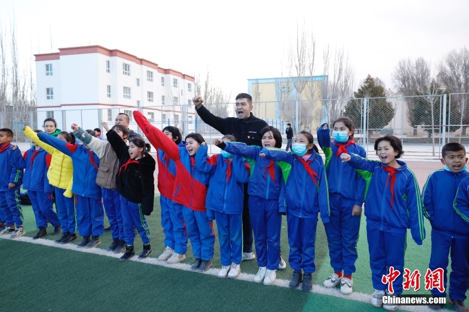 新疆很多人喜爱足球。在新疆阿图什,人们更是骄傲于当地浓厚的足球氛围和良好的群众基础。13日,中新社记者来到阿图什市上阿图什镇依克萨克小学,一场乡村小学间的足球赛正激烈进行。图为同学们在校长的带领下为足球赛加油。(中新社记者 韩海丹 摄)