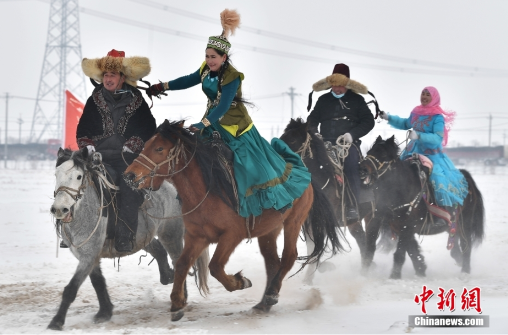 12月21日,中国唯一的乌孜别克族民族乡——新疆木垒县大南沟乌孜别克族乡举行冬宰节活动,吸引各方游客前来观赏文体节目、品尝传统美食。乌孜别克族乡以牛羊等牲畜为传统养殖,每年的第一场大雪后牧民会选择膘肥体壮的牲畜过冬宰节,储备冬肉。图为冬宰节上当地村民在雪中进行传统马上体育运动“姑娘追”活动。(中新社记者 张斌 摄)