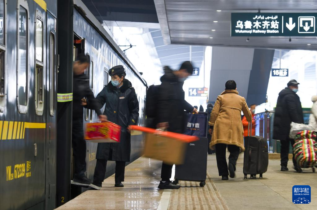 1月17日,在乌鲁木齐站,列车员在引导乘客下车。