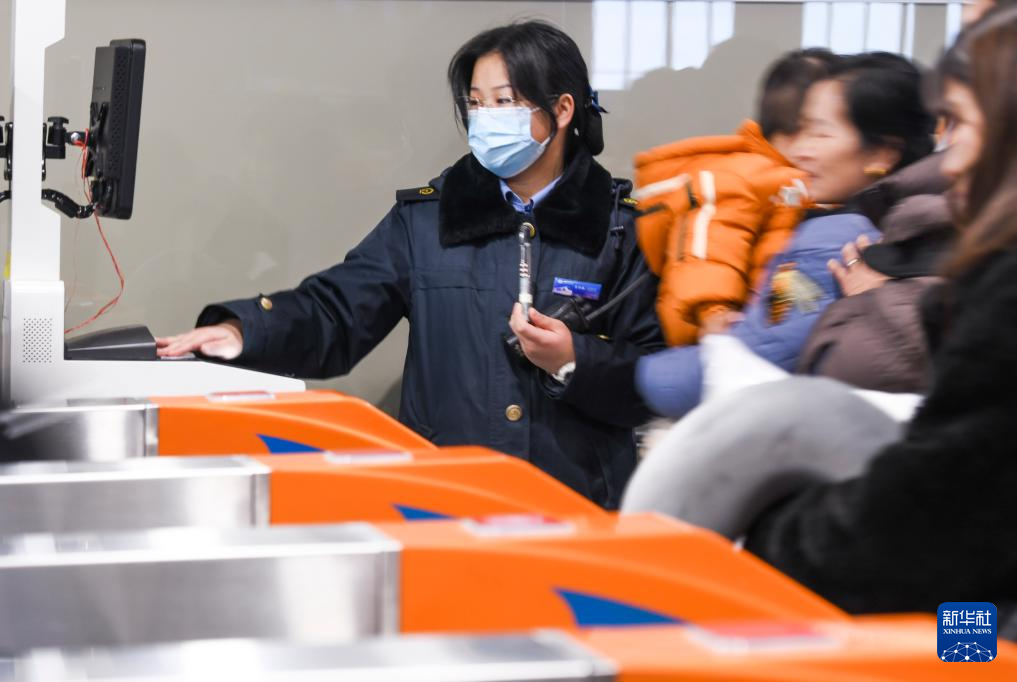 1月17日,在乌鲁木齐站,铁路工作人员在引导乘客有序进入候车大厅。