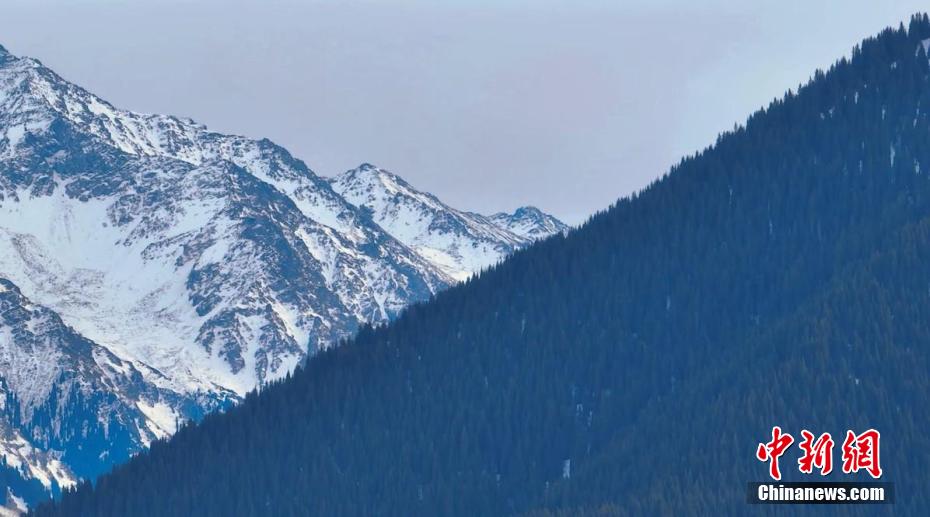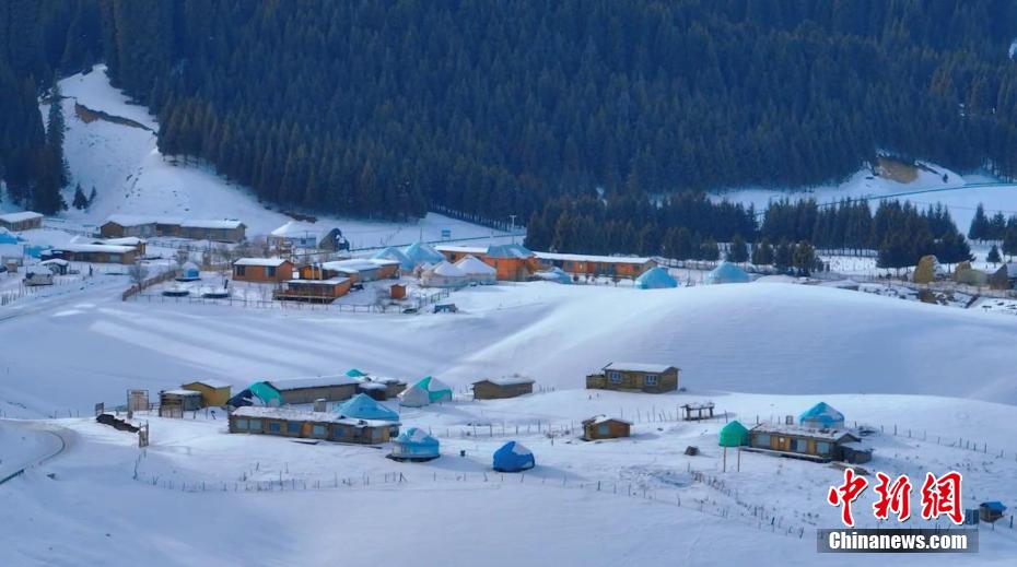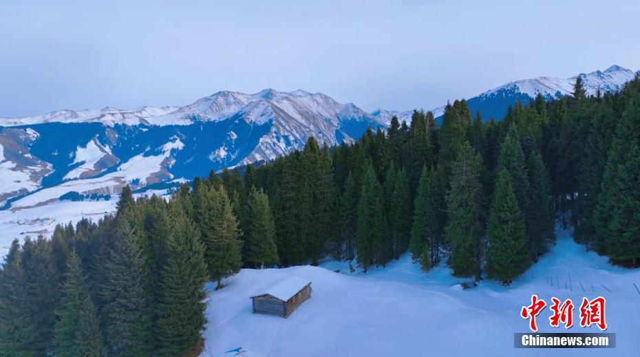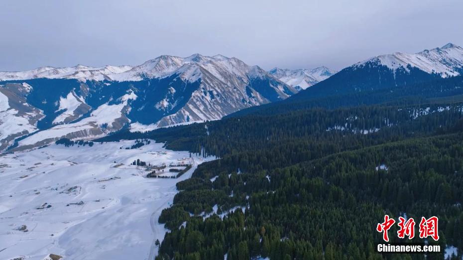 近日,位于新疆伊犁哈萨克自治州特克斯县的“中国历史文化名村”琼库什台村,一场降雪过后,草原被薄雪覆盖。从空中俯瞰,山坡上,雪岭云杉苍翠挺拔,山坡下,被白雪包围的木屋和毡房错落有致,山上的松翠与山下的白雪共同营造出了一幅空旷静谧的水墨画卷。