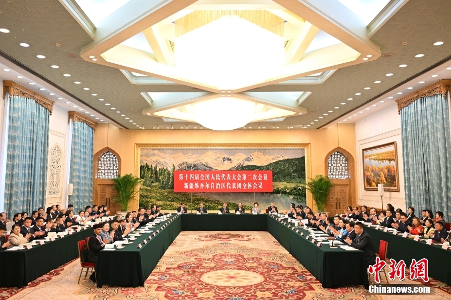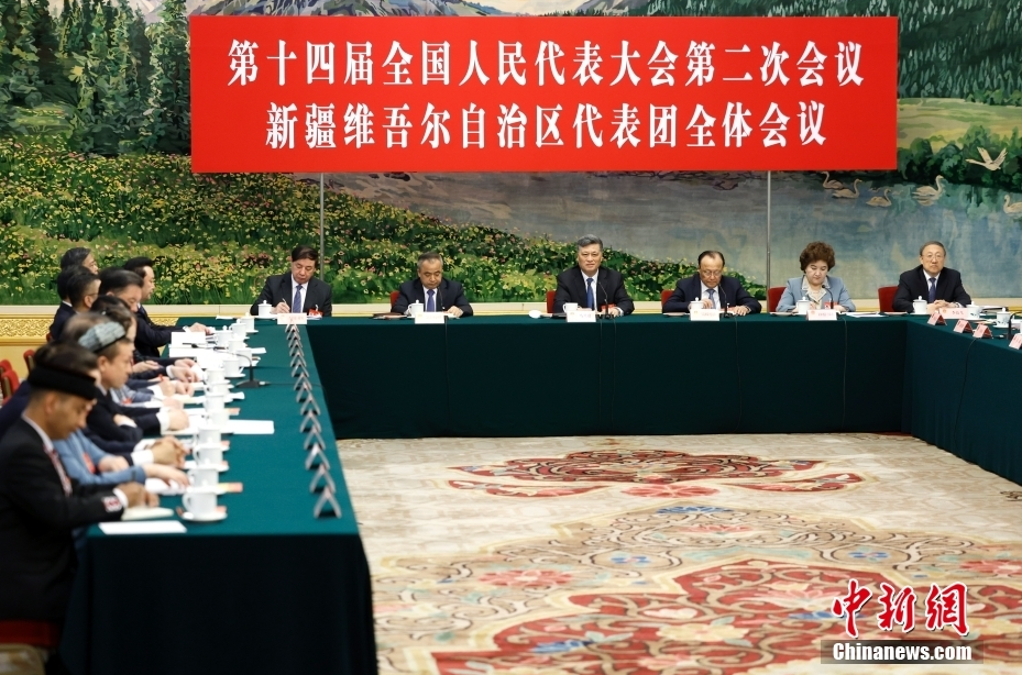 3月7日,出席十四届全国人大二次会议的新疆代表团举行开放团组会议,审议政府工作报告并回答记者提问。(中新社记者 田雨昊 摄)