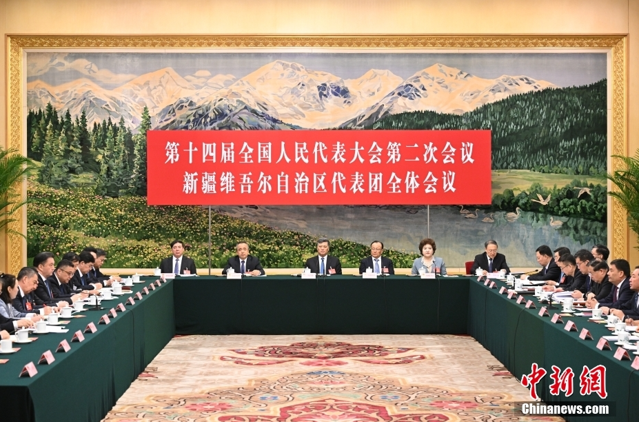 3月7日,出席十四届全国人大二次会议的新疆代表团举行开放团组会议,审议政府工作报告并回答记者提问。图为全国人大代表、新疆维吾尔自治区党委书记马兴瑞(右四)发言。(中新社记者 富田 摄)