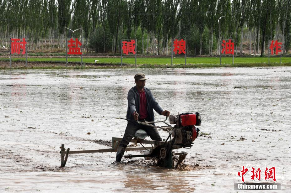 5月13日,在位于该市帕哈太克里乡的“海水稻”种植基地,各类机械和工作人员都忙碌起来,抢抓农时进行“海水稻”播种工作。随着气温回升,新疆喀什市的1.3万亩“海水稻”进入插秧期。图为工作人员驾驶着插秧机,抢抓农时进行“海水稻”播种工作。(中新网记者 孙亭文 摄)