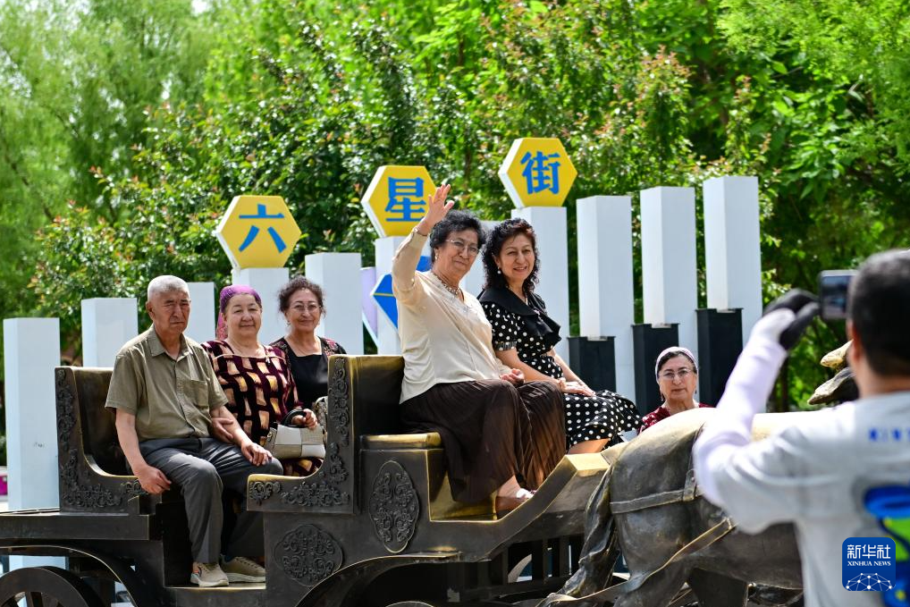在伊犁哈萨克自治州伊宁市六星街,游客在中心广场打卡拍照(5月12日摄)。新华社记者 丁磊 摄