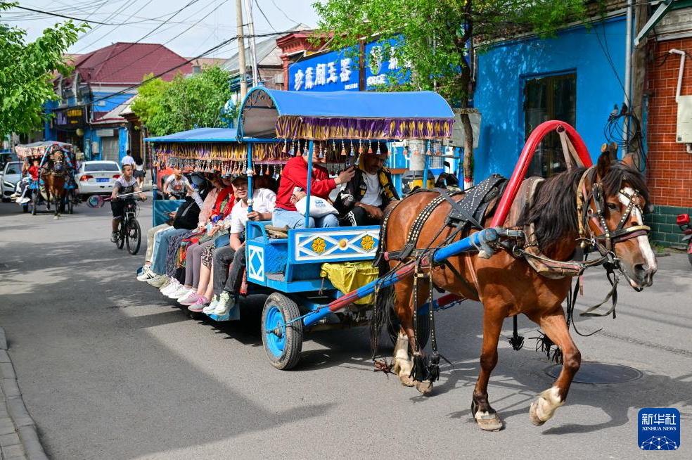 在伊犁哈萨克自治州伊宁市喀赞其民俗旅游区,游客乘坐马车观光游览(5月10日摄)。新华社记者 丁磊 摄