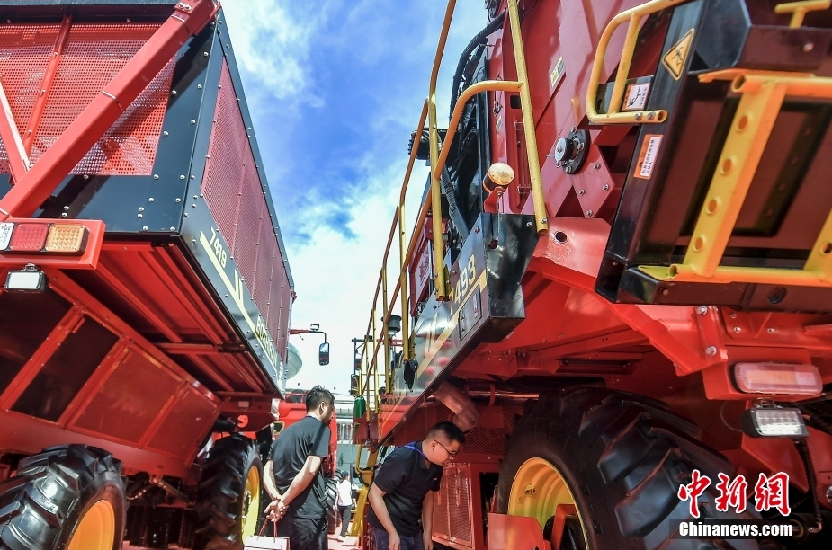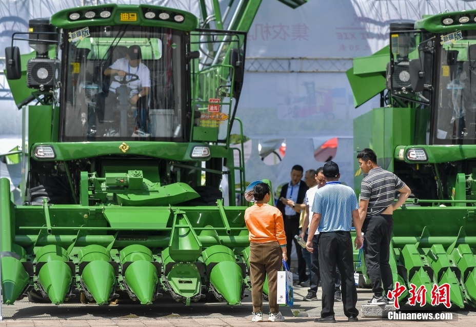 5月25日,第二十四届新疆农业机械博览会在乌鲁木齐市开幕。据介绍,博览会以“智慧农业·智能农机与农业现代化”为主题,聚焦农机装备产业和农业全产业链创新发展。图为农机设备吸引参观者。(中新社记者 刘新 摄)