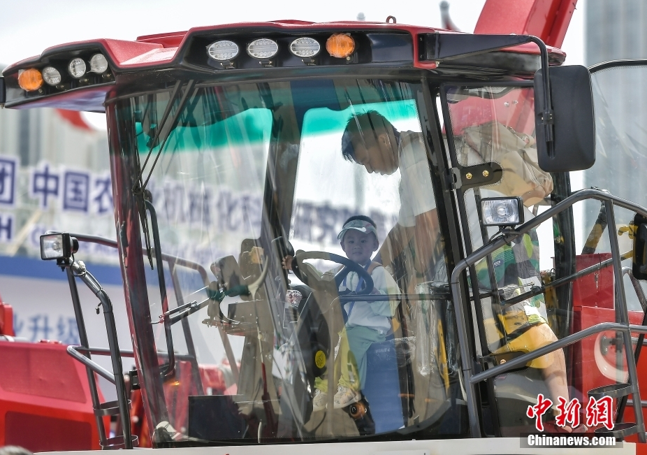 5月25日,第二十四届新疆农业机械博览会在乌鲁木齐市开幕。据介绍,博览会以“智慧农业·智能农机与农业现代化”为主题,聚焦农机装备产业和农业全产业链创新发展。图为家长带着小朋友登上大型采棉机驾驶舱进行体验。(中新社记者 刘新 摄)