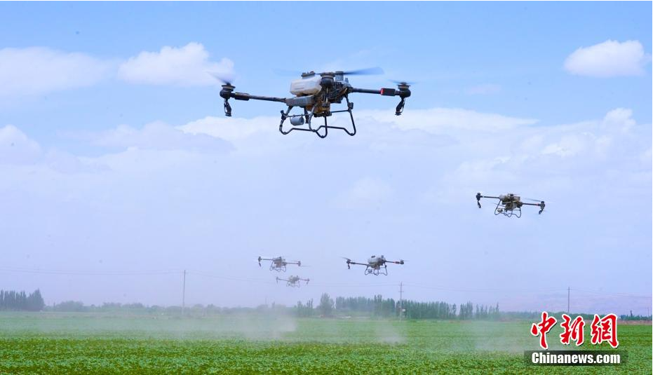 6月12日,在新疆图木舒克市棉田里,多架植保无人机正在进行棉苗有机微量元素补充,场面壮观。据了解,无人机植保具有精准、高效、安全等优势,可大大提高作物的品质和产量。图为多架无人机正在进行植保作业。(孟九汀 摄)
