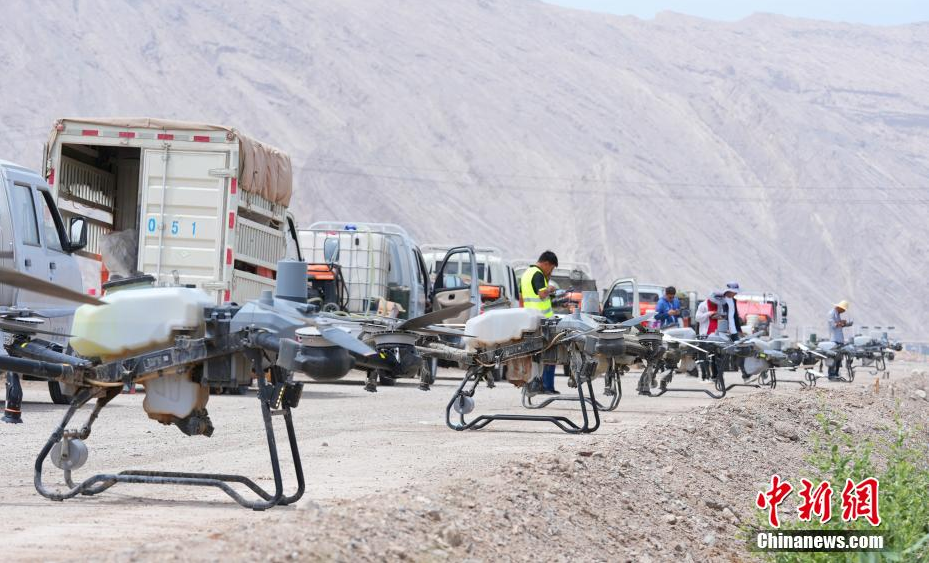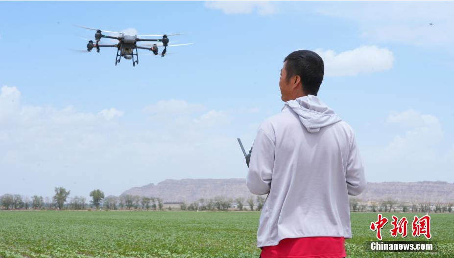 6月12日,在新疆图木舒克市棉田里,多架植保无人机正在进行棉苗有机微量元素补充,场面壮观。据了解,无人机植保具有精准、高效、安全等优势,可大大提高作物的品质和产量。图为“飞手”操控无人机。(孟九汀 摄)