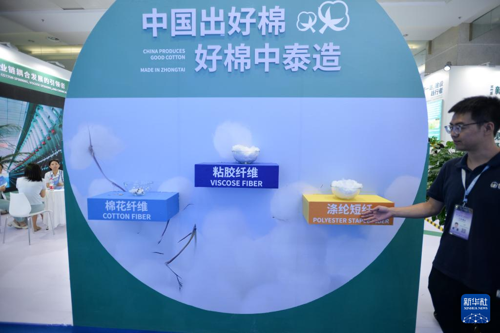 6月30日,在第八届中国—亚欧博览会上,新疆中泰(集团)有限责任公司工作人员展示纺织材料产品。|6月26日至30日,第八届中国—亚欧博览会在新疆乌鲁木齐举办。本届亚博会上展出新疆油气生产加工、煤炭煤电煤化工、绿色矿业、粮油、棉花和纺织服装、绿色有机果蔬、优质畜产品、新能源新材料等产业发展成果,受到国内外展商和参展者关注。|新华社记者 李任滋 摄