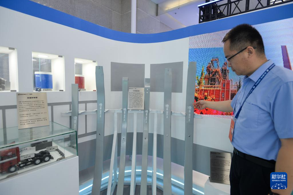 6月30日,在第八届中国—亚欧博览会上,新疆八钢金属制品有限公司工作人员展示公司产品。(新华社记者 李任滋 摄)