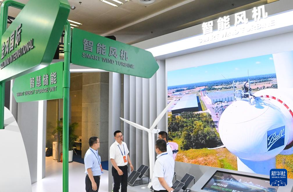 6月27日,在第八届中国—亚欧博览会上,参展商在了解金风科技智能风机性能。(新华社记者 王菲 摄)