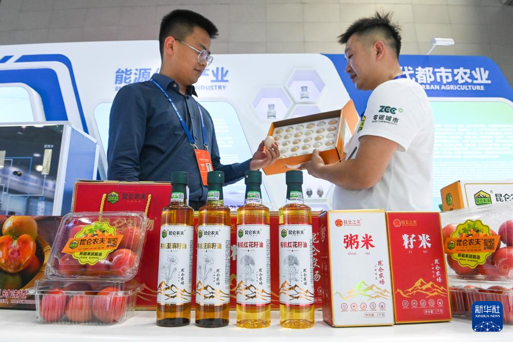 6月28日,在第八届中国—亚欧博览会上,新疆国杰农业科技有限公司工作人员(右)在向参展商介绍该公司在乌鲁木齐县水西沟镇平西梁村昆仑农场零碳农业科技示范园种植生产的农产品。(新华社记者 王菲 摄)