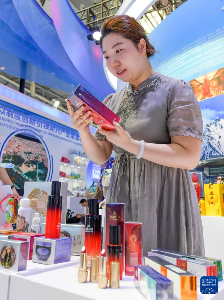 6月26日,在第八届中国—亚欧博览会上,工作人员在乌鲁木齐展区摆放亲努尔生物科技有限公司自主研发的番茄红素经典护肤系列化妆品。(新华社记者 王菲 摄)