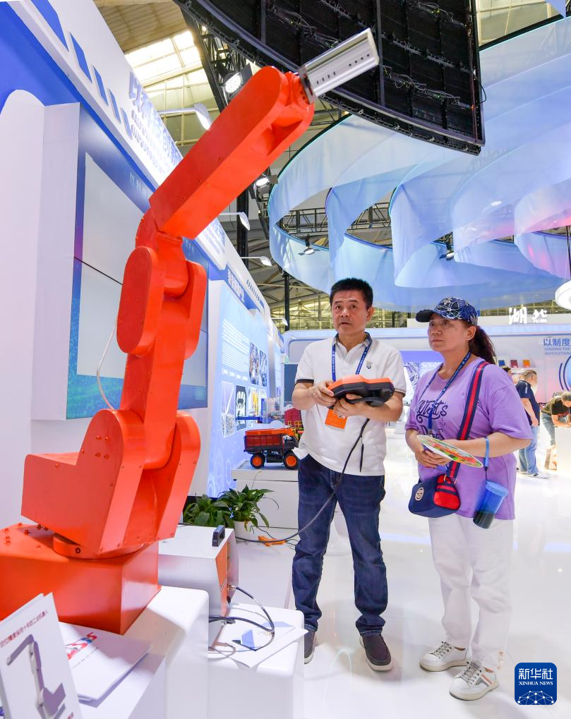 6月26日,在第八届中国—亚欧博览会乌鲁木齐展区,工作人员操作演示六轴工业机器人。(新华社记者 王菲 摄)