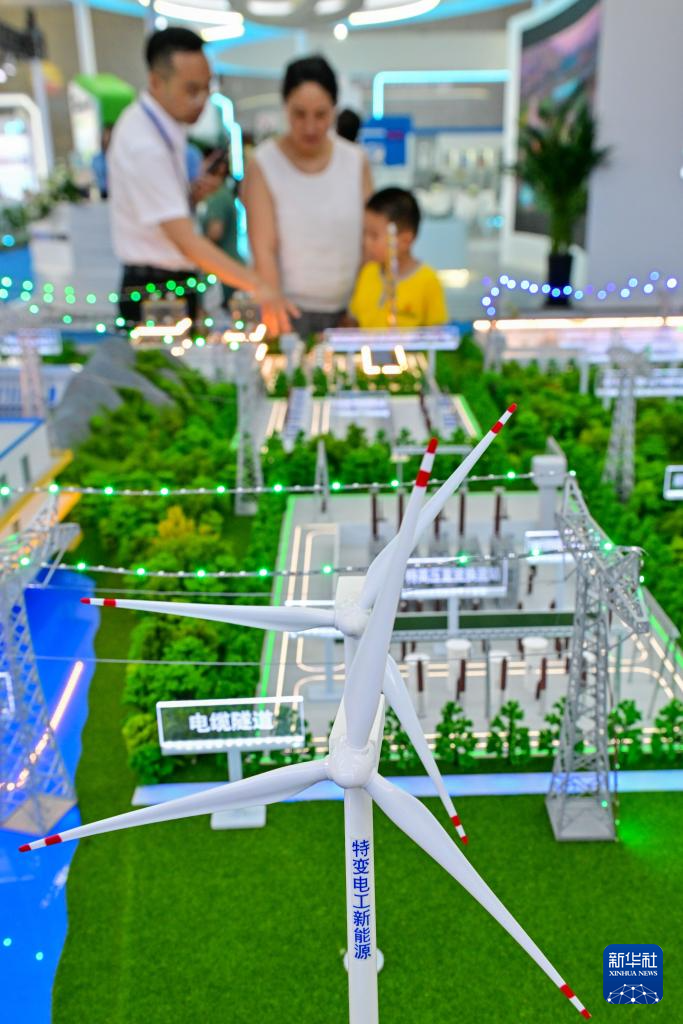 6月27日,在第八届中国-亚欧博览会上,参观者在特变电工展区了解以清洁能源为基础的输变电装备。(新华社记者 丁磊 摄)