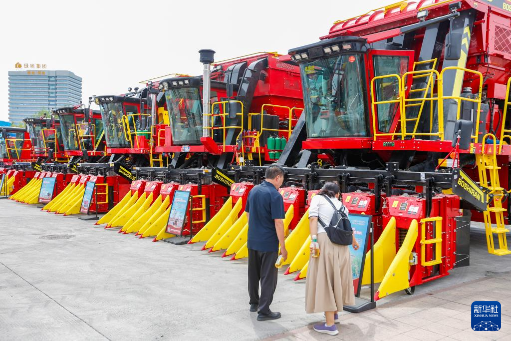 6月30日,在第八届中国——亚欧博览会上,观众在了解新疆钵施然智能农机股份有限公司制造的采棉机。(新华社记者 陈朔 摄)