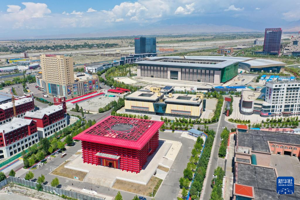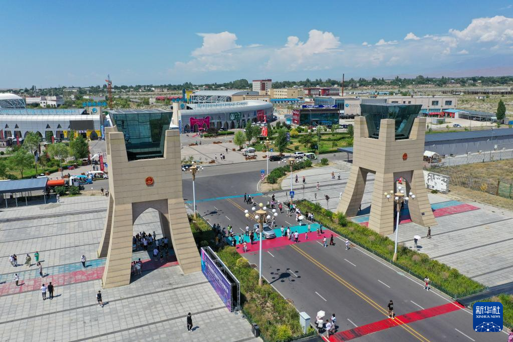 这是7月26日拍摄的中哈霍尔果斯国际边境合作中心一角(无人机照片)。|自2023年11月10日中哈互免签证协定正式生效以来,新疆霍尔果斯口岸出入境人数呈现大幅增长态势。连日来,位于中国(新疆)自由贸易试验区霍尔果斯片区的中哈霍尔果斯国际边境合作中心迎来边境游、跨境游、购物游客流高峰。|新华社记者 丁磊 摄
