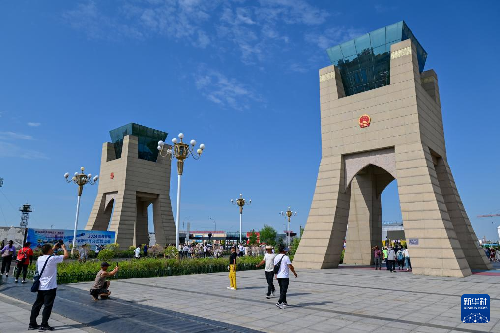 在中哈霍尔果斯国际边境合作中心,游客在中哈连接通道拍照打卡(7月26日摄)。|自2023年11月10日中哈互免签证协定正式生效以来,新疆霍尔果斯口岸出入境人数呈现大幅增长态势。连日来,位于中国(新疆)自由贸易试验区霍尔果斯片区的中哈霍尔果斯国际边境合作中心迎来边境游、跨境游、购物游客流高峰。|新华社记者 丁磊 摄