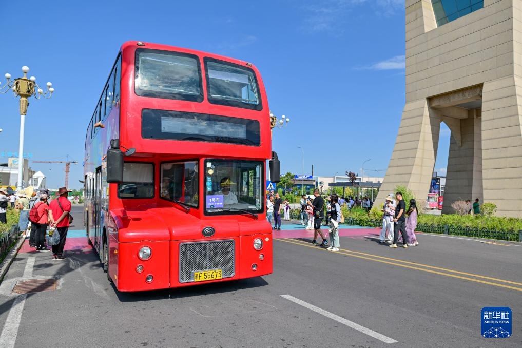 在中哈霍尔果斯国际边境合作中心,旅游巴士进入中方一侧(7月26日摄)。|自2023年11月10日中哈互免签证协定正式生效以来,新疆霍尔果斯口岸出入境人数呈现大幅增长态势。连日来,位于中国(新疆)自由贸易试验区霍尔果斯片区的中哈霍尔果斯国际边境合作中心迎来边境游、跨境游、购物游客流高峰。|新华社记者 丁磊 摄