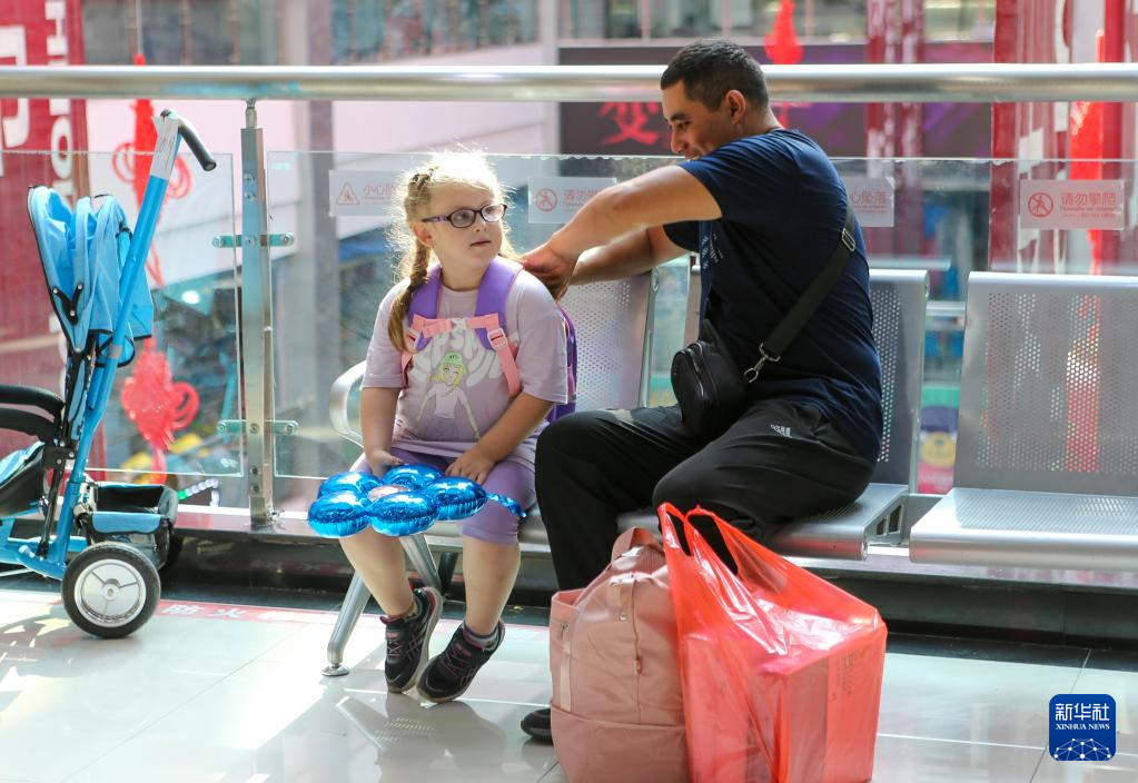 在中哈霍尔果斯国际边境合作中心,来自哈萨克斯坦的游客在购物后休息(7月26日摄)。|自2023年11月10日中哈互免签证协定正式生效以来,新疆霍尔果斯口岸出入境人数呈现大幅增长态势。连日来,位于中国(新疆)自由贸易试验区霍尔果斯片区的中哈霍尔果斯国际边境合作中心迎来边境游、跨境游、购物游客流高峰。|新华社记者 林立平 摄