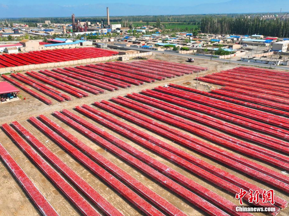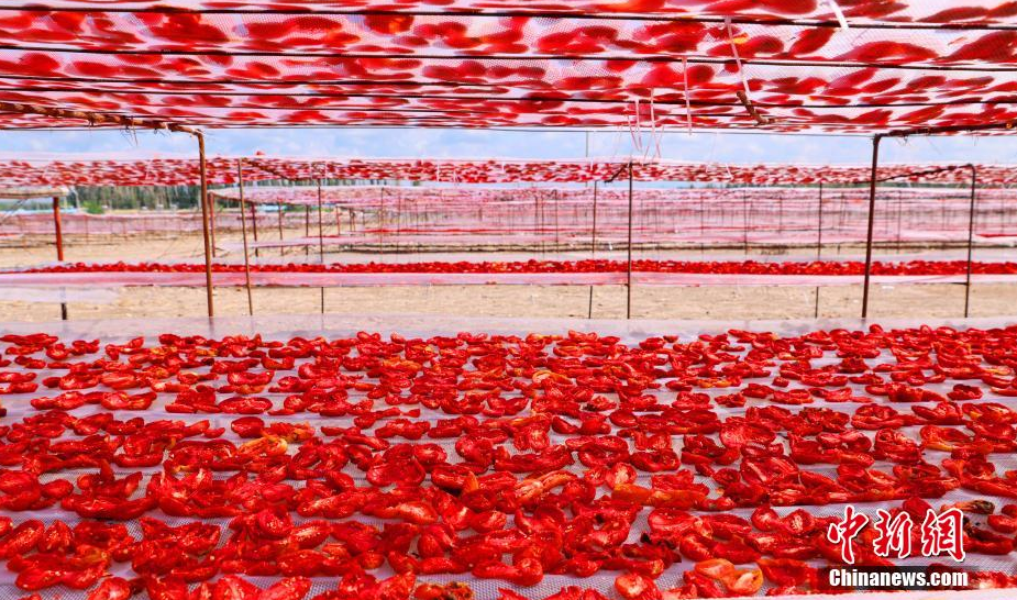 8月以来,新疆焉耆垦区8万亩番茄迎来采收晾晒季。戈壁滩上,番茄晒场连绵数公里,宛如红色地毯,蔚为壮观。据介绍,当地天然晾晒的番茄干成为海外客商的抢手货。白克斌 摄