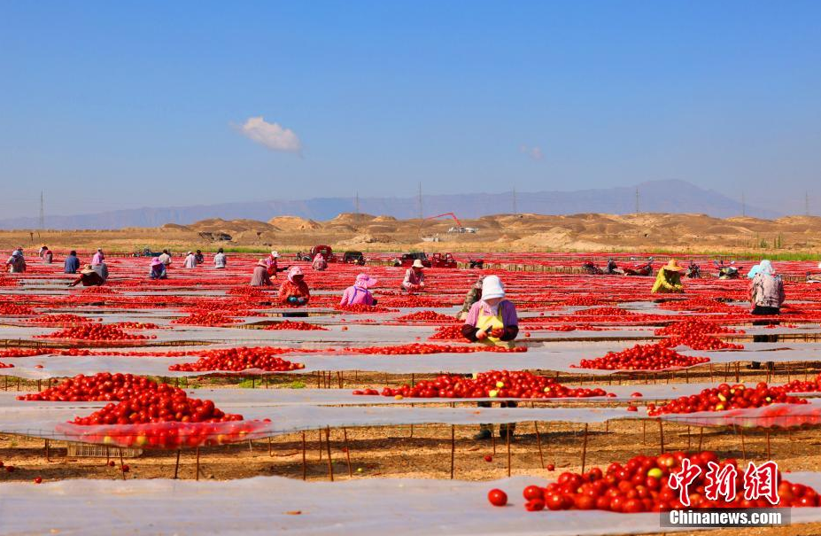 8月以来,新疆焉耆垦区8万亩番茄迎来采收晾晒季。戈壁滩上,番茄晒场连绵数公里,宛如红色地毯,蔚为壮观。图为8月9日,职工们正在切削、晾晒番茄干。白克斌 摄
