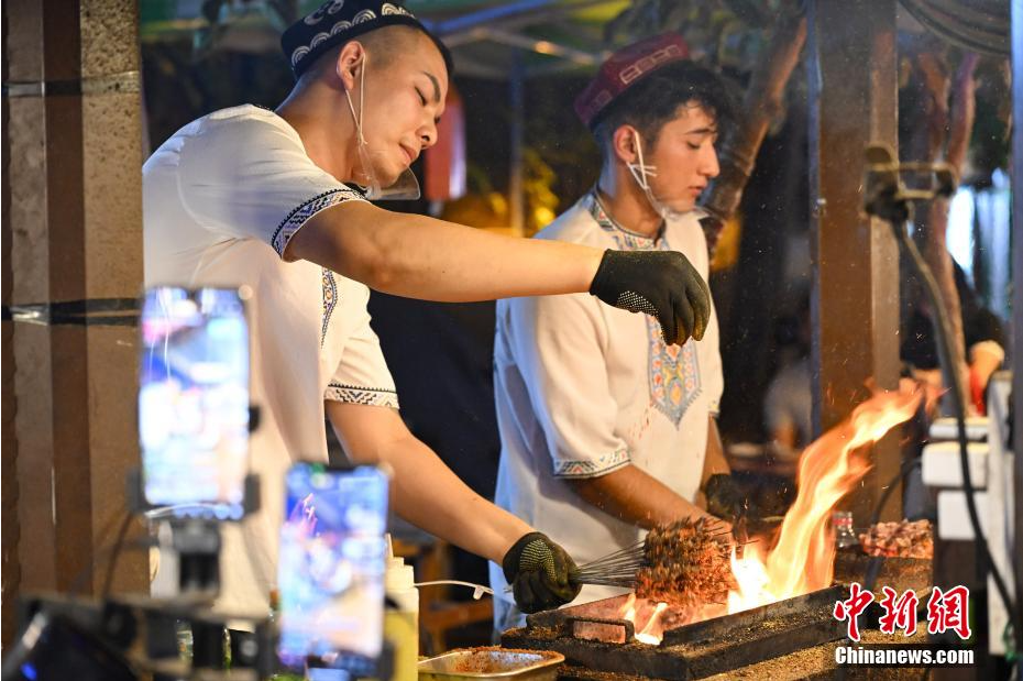 8月25日晚,商户在喀什古城景区为游客制作美食。喀什古城景区位于新疆维吾尔自治区喀什市,于2015年7月20日正式挂牌成为国家5A景区。该景区与居民生活区融为一体,有着极具特色的迷宫式城市街区和生土建筑群。(中新社记者 田雨昊 摄)