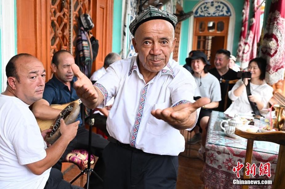 8月26日,喀什古城景区一家茶馆的工作人员在为游客表演舞蹈。喀什古城景区位于新疆维吾尔自治区喀什市,于2015年7月20日正式挂牌成为国家5A景区。该景区与居民生活区融为一体,有着极具特色的迷宫式城市街区和生土建筑群。(中新社记者 田雨昊 摄)