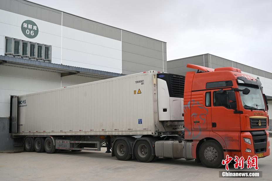 8月27日,“追风逐日看新疆”主题采访团一行来到了新疆喀什地区的叶城县,实地探访了这座南疆最大的冷链仓储物流基地。该基地在昆仑山脚下的新疆叶城县以东十公里处,总占地面积500亩,配有18座保鲜库,6座冷冻库和3座加工车间。图为冷链货车等待装载新梅。(中新社记者 田雨昊 摄)
