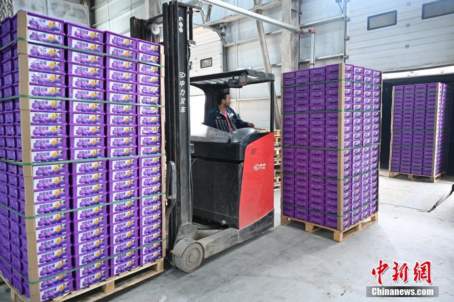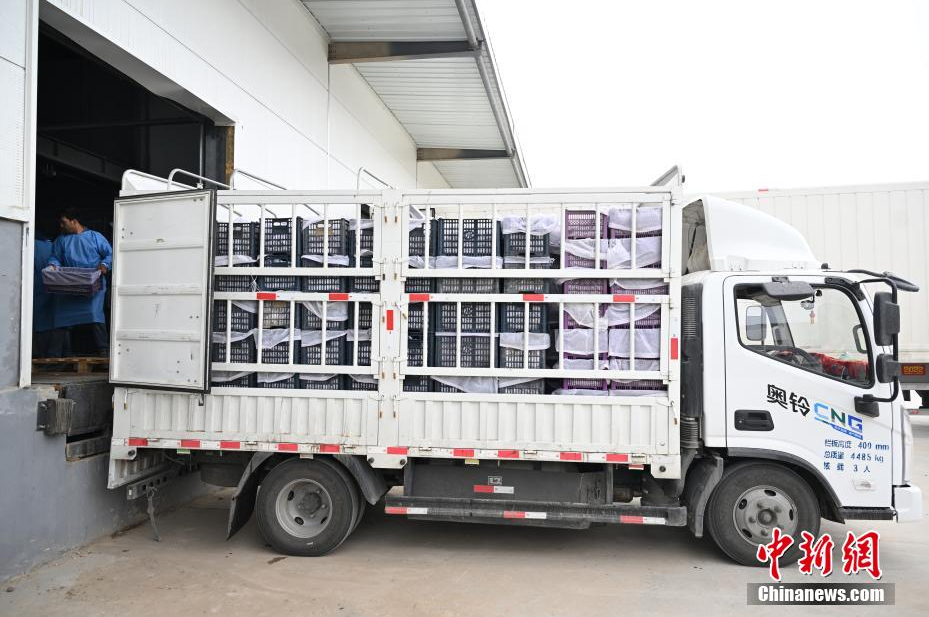 8月27日,“追风逐日看新疆”主题采访团一行来到了新疆喀什地区的叶城县,实地探访了这座南疆最大的冷链仓储物流基地。该基地在昆仑山脚下的新疆叶城县以东十公里处,总占地面积500亩,配有18座保鲜库,6座冷冻库和3座加工车间。图为工作人员将包装好的新梅装上冷链货车。(中新社记者 田雨昊 摄)