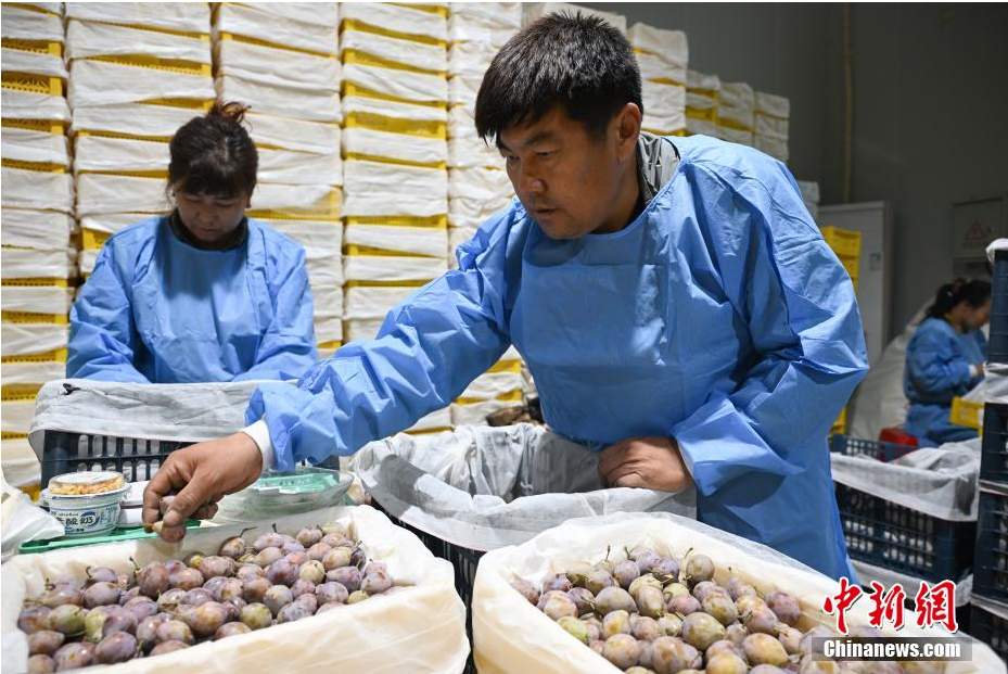 8月27日,“追风逐日看新疆”主题采访团一行来到了新疆喀什地区的叶城县,实地探访了这座南疆最大的冷链仓储物流基地。该基地在昆仑山脚下的新疆叶城县以东十公里处,总占地面积500亩,配有18座保鲜库,6座冷冻库和3座加工车间。图为工作人员在冷库对新梅进行分拣、装箱。(中新社记者 田雨昊 摄)
