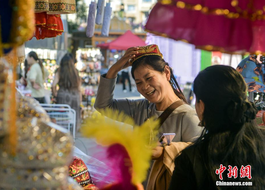 9月12日,新疆乌鲁木齐大巴扎景区,游客选购花帽。进入秋季,乌鲁木齐大巴扎景区旅游热度持续“在线”,各种民俗表演及丰富的特色旅游商品吸引来自全国各地的游客参观、游览、购物。(中新社记者 刘新 摄)