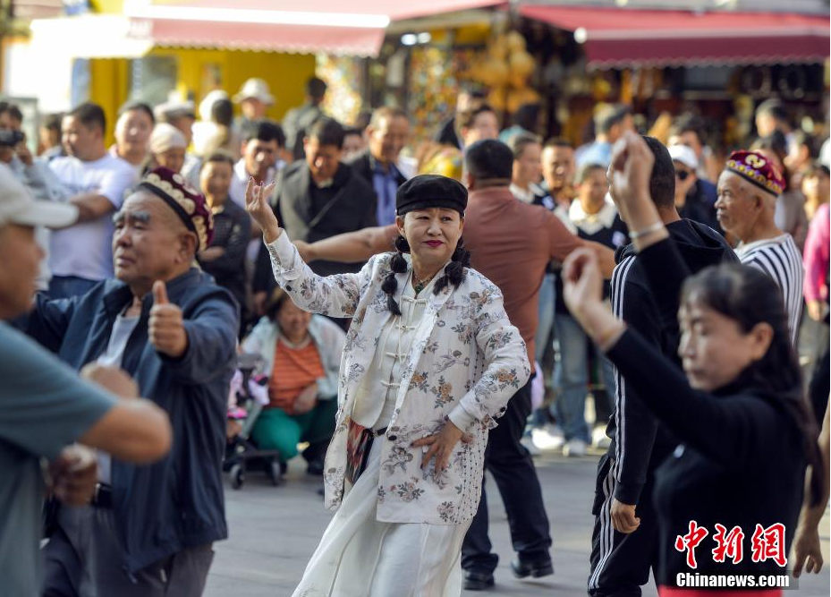 9月12日,新疆乌鲁木齐大巴扎景区,游客与当地居民一起跳起欢快的民族舞蹈。进入秋季,乌鲁木齐大巴扎景区旅游热度持续“在线”,各种民俗表演及丰富的特色旅游商品吸引来自全国各地的游客参观、游览、购物。(中新社记者 刘新 摄)