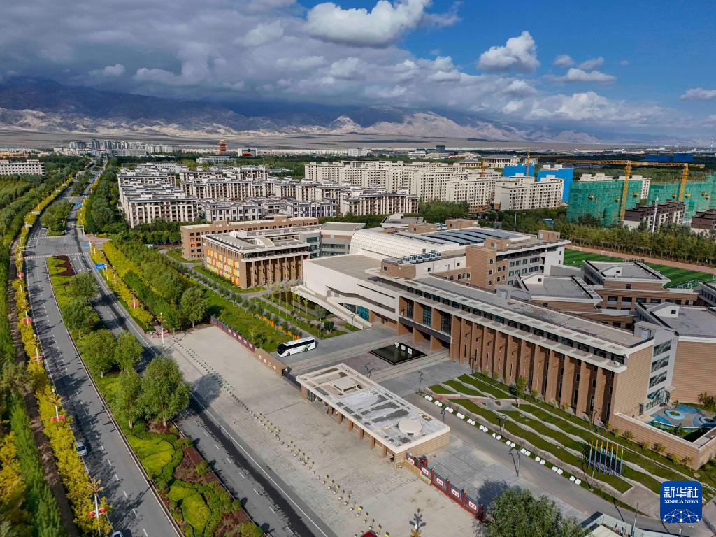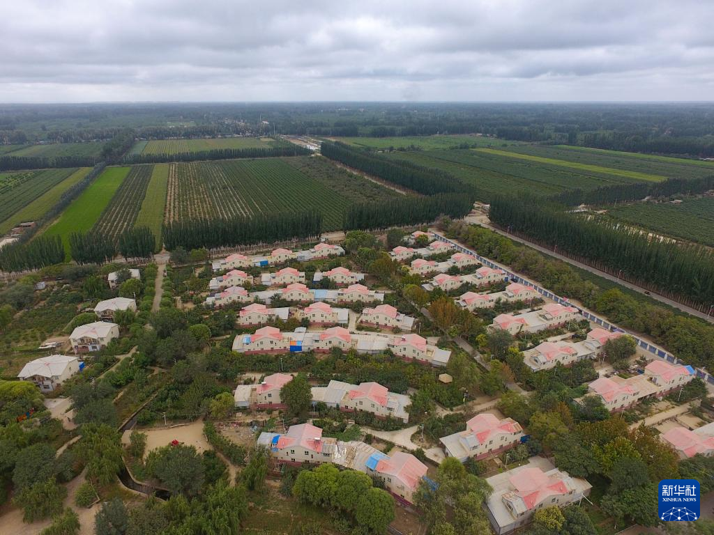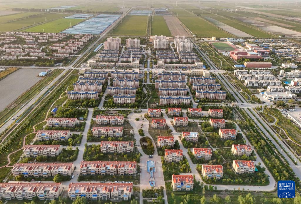 这是2024年9月4日拍摄的新疆生产建设兵团第十四师昆玉市七十四团老兵镇的一处小区(无人机照片)。|原始简陋的地窝子变成了高耸挺立的城市高楼,寸草不生的戈壁荒漠变成了生机勃勃的现代化良田,手拉肩扛的人工劳作变成了科技高效的智能生产……成立70年来,新疆生产建设兵团的变化天翻地覆,各族职工群众的生活蒸蒸日上。|新华社记者 陈朔 摄