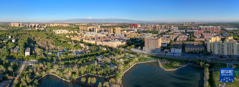 这是2024年5月15日拍摄的新疆生产建设兵团第八师石河子市城区一景(无人机照片)。|原始简陋的地窝子变成了高耸挺立的城市高楼,寸草不生的戈壁荒漠变成了生机勃勃的现代化良田,手拉肩扛的人工劳作变成了科技高效的智能生产……成立70年来,新疆生产建设兵团的变化天翻地覆,各族职工群众的生活蒸蒸日上。|新华社记者 胡虎虎 摄