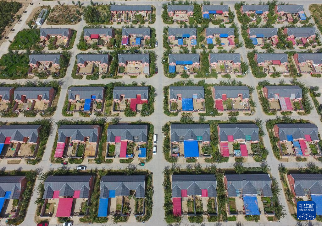 这是2024年9月6日拍摄的新疆生产建设兵团第三师图木舒克市五十四团前海镇的房屋(无人机照片)。|原始简陋的地窝子变成了高耸挺立的城市高楼,寸草不生的戈壁荒漠变成了生机勃勃的现代化良田,手拉肩扛的人工劳作变成了科技高效的智能生产……成立70年来,新疆生产建设兵团的变化天翻地覆,各族职工群众的生活蒸蒸日上。|新华社记者 陈朔 摄