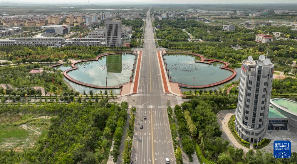这是2024年9月4日拍摄的新疆生产建设兵团第二师铁门关市城区一角(无人机照片)。|原始简陋的地窝子变成了高耸挺立的城市高楼,寸草不生的戈壁荒漠变成了生机勃勃的现代化良田,手拉肩扛的人工劳作变成了科技高效的智能生产……成立70年来,新疆生产建设兵团的变化天翻地覆,各族职工群众的生活蒸蒸日上。|新华社记者 胡虎虎 摄