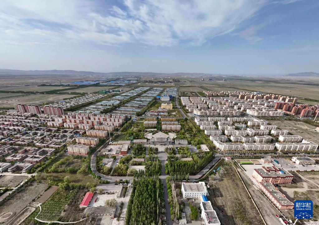 这是2024年5月13日拍摄的新疆生产建设兵团第十二师西山农牧场的小区(无人机全景照片)。|原始简陋的地窝子变成了高耸挺立的城市高楼,寸草不生的戈壁荒漠变成了生机勃勃的现代化良田,手拉肩扛的人工劳作变成了科技高效的智能生产……成立70年来,新疆生产建设兵团的变化天翻地覆,各族职工群众的生活蒸蒸日上。|新华社记者 胡虎虎 摄