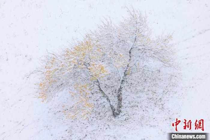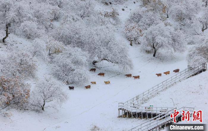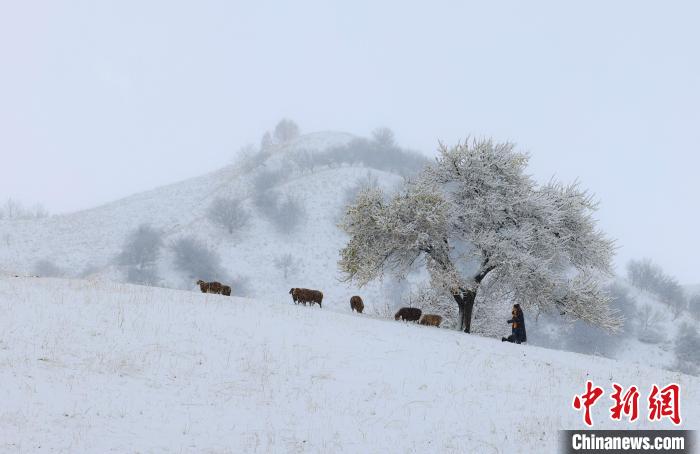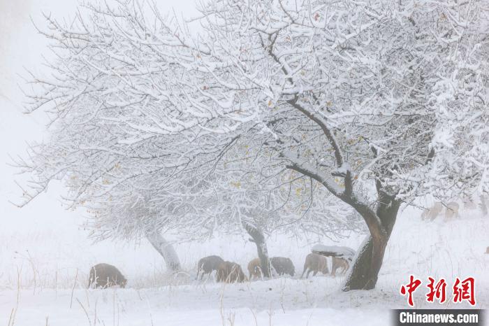 近日,新疆新源县那拉提杏花谷迎来了一场降雪,大雪纷纷飘落,伴随着雾气,一时间,杏花谷变成了一片银装素裹的世界。一些尚未褪尽树叶的野杏树上挂满雪花,半树黄叶半树雪白,雪景与秋色相映成趣。马、牛、羊在“画中”游走,给冬季的杏花谷增添了灵动的气息,俨然构成了一幅天然的水墨画。张文庭 摄