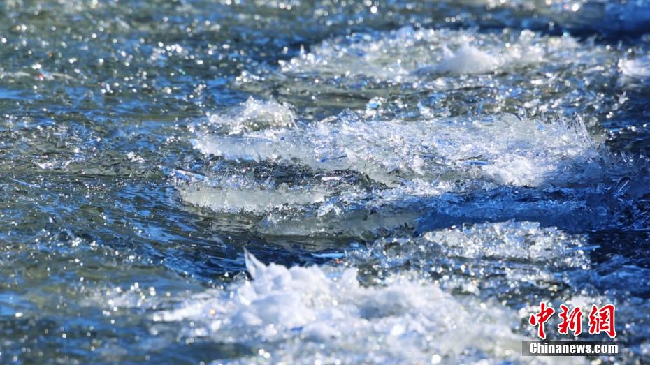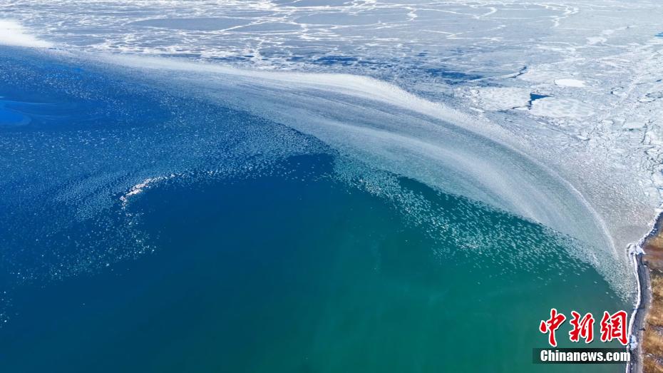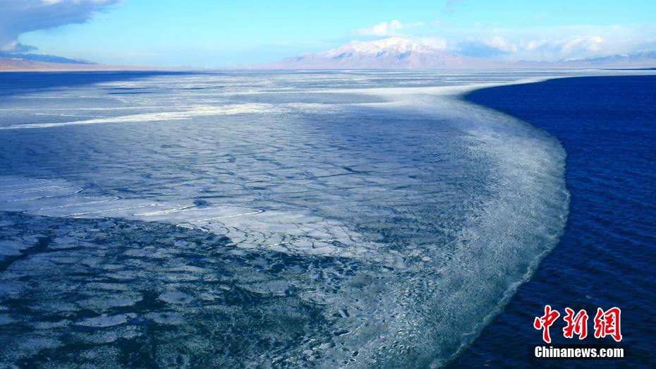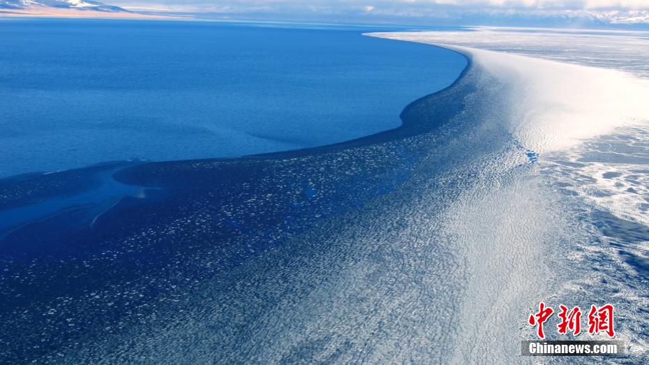 连日来,随着气温回暖,新疆博州赛里木湖冰雪消融,“半湖脂玉半湖蓝”胜景如期而至。湖冰从边沿处撕裂,风起水动,裂缝愈来愈大,在交织处破碎成片,慢慢成块,犹如拼图浮在水面。冰块随风而动,被推向一处,一条“冰水线”赫然而现,冰与水泾渭分明,冰如凝脂白玉,水若湛蓝宝石,两色交融,形成壮观的赛里木湖冰推奇观。(钟大玮 摄)
