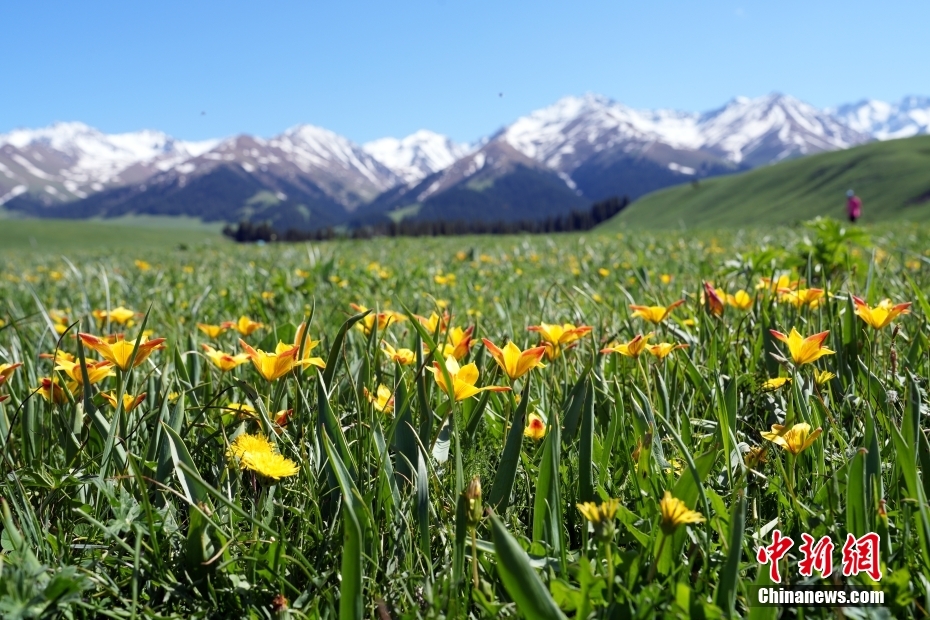 进入五月,位于新疆伊犁哈萨克自治州的那拉提草原进入盛花期,鲜花、草原牧场与远方天山山脉上的白雪构成一幅自然美景,吸引众多游客。那拉提2024全年接待游客389万余人,同比上升58.46%,其中日接待游客最高达到4.66万人,游客接待量、旅游收入均创历史新高。图为5月14日拍摄的新疆那拉提草原美景。(中新社发 毛建军 摄)
